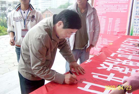 4月23日是第14个“世界读书日”,为提高大学生自身素质,激发同学们的读书热情,读书成才促进会、图书馆义务馆员服务中心及历史与社会学院学生会青年志愿者部在图书馆门前举行了“一本好书,一生财富”大型签名等系列活动。校领导王磊、陈士夫等在签字条幅上一一签下自己的名字,将活动推向高潮。