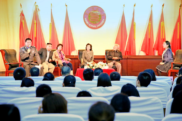 为进一步弘扬社会正能量,践行社会主义核心价值观,推进我校文明创建活动,11月5日下午,由我校宣传部、思想政治理论教育教学与研究中心和淮北市文明办主办的中国好人先进事迹宣讲会在文南111成功举办。本次宣讲会邀请了诚实守信的中国好人石宗宏,助人为乐的中国好人王小勇、王启军、荐雪梅,孝老爱亲的中国好人李玉美担任主讲。校党委副书记、纪委书记、校文明委副主任朱德顺出席宣讲会并致辞。淮北市文明办、淮北日报社、校宣传部、校思政中心负责人参加宣讲会,300余名师生到场聆听了中国好人先进事迹。
